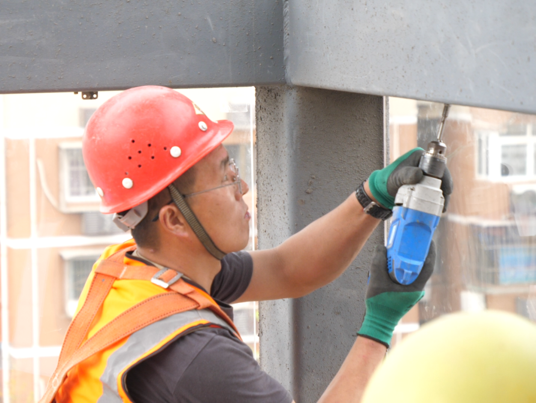 記者在雙陽南區20號樓看到,這里建起了施工圍擋,又一部加裝電梯鋼結構井道拼裝完成,工程進入安裝電梯玻璃階段。